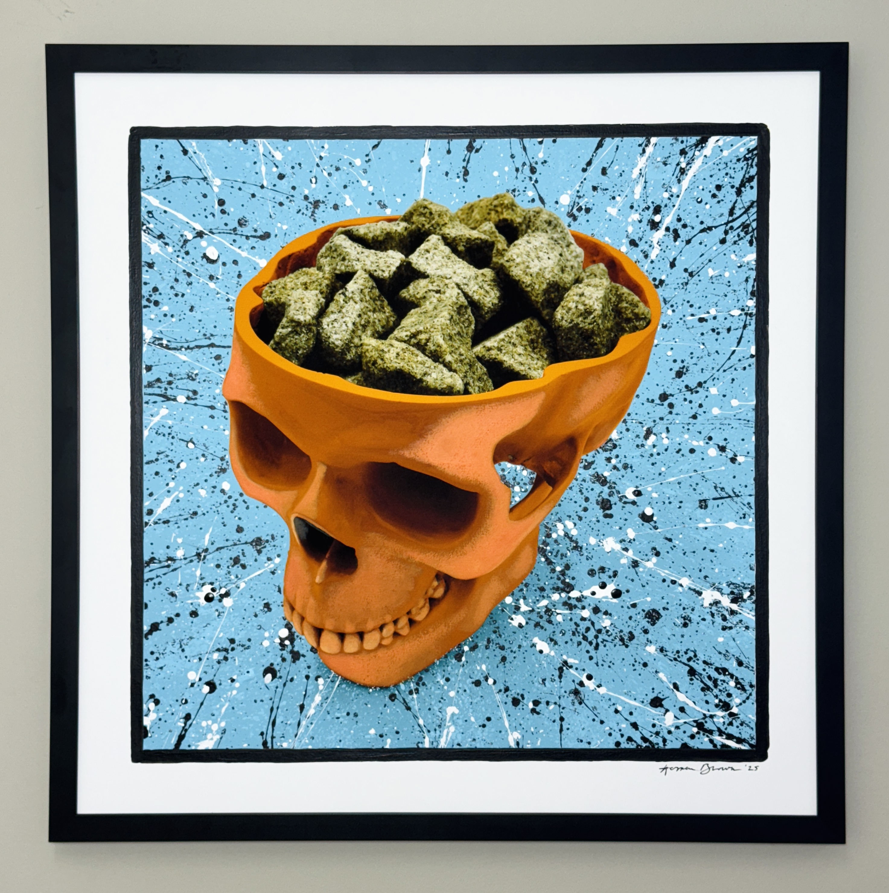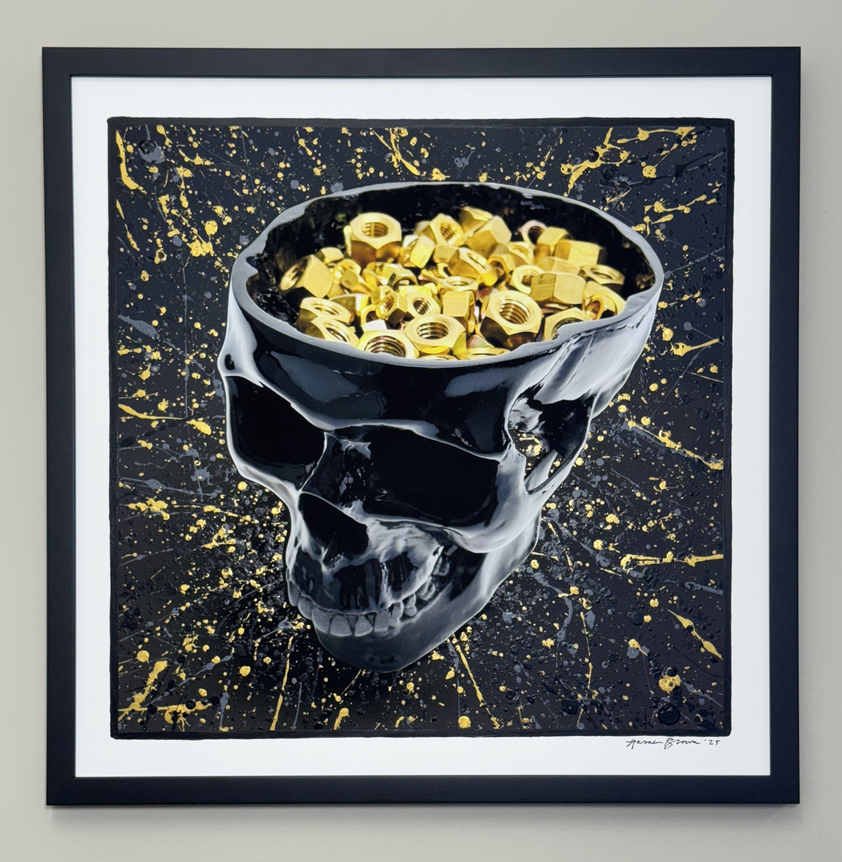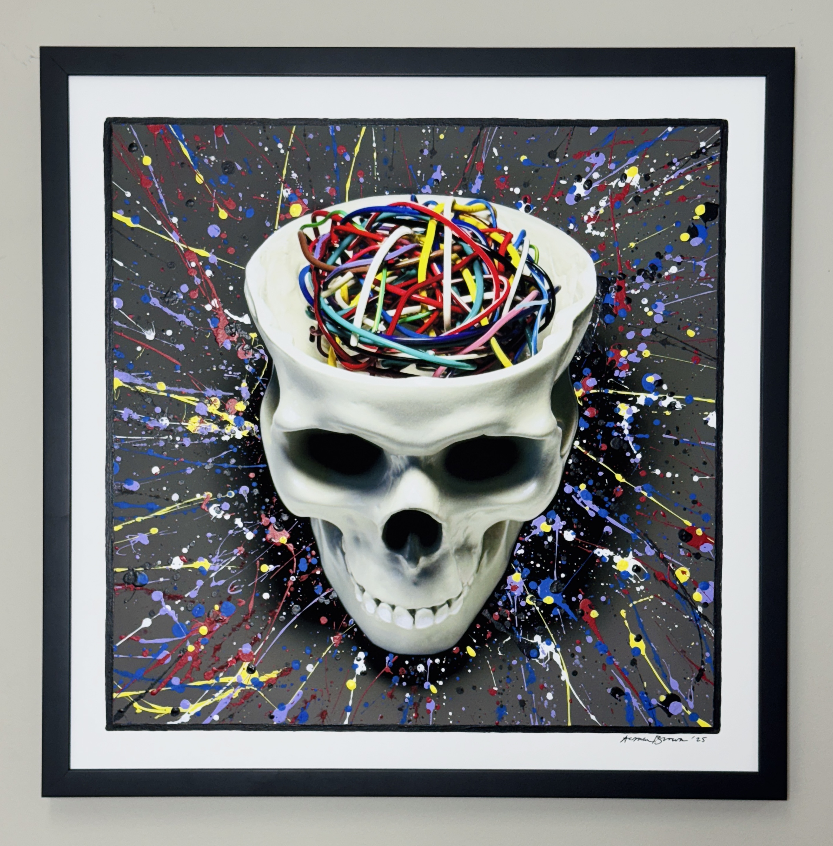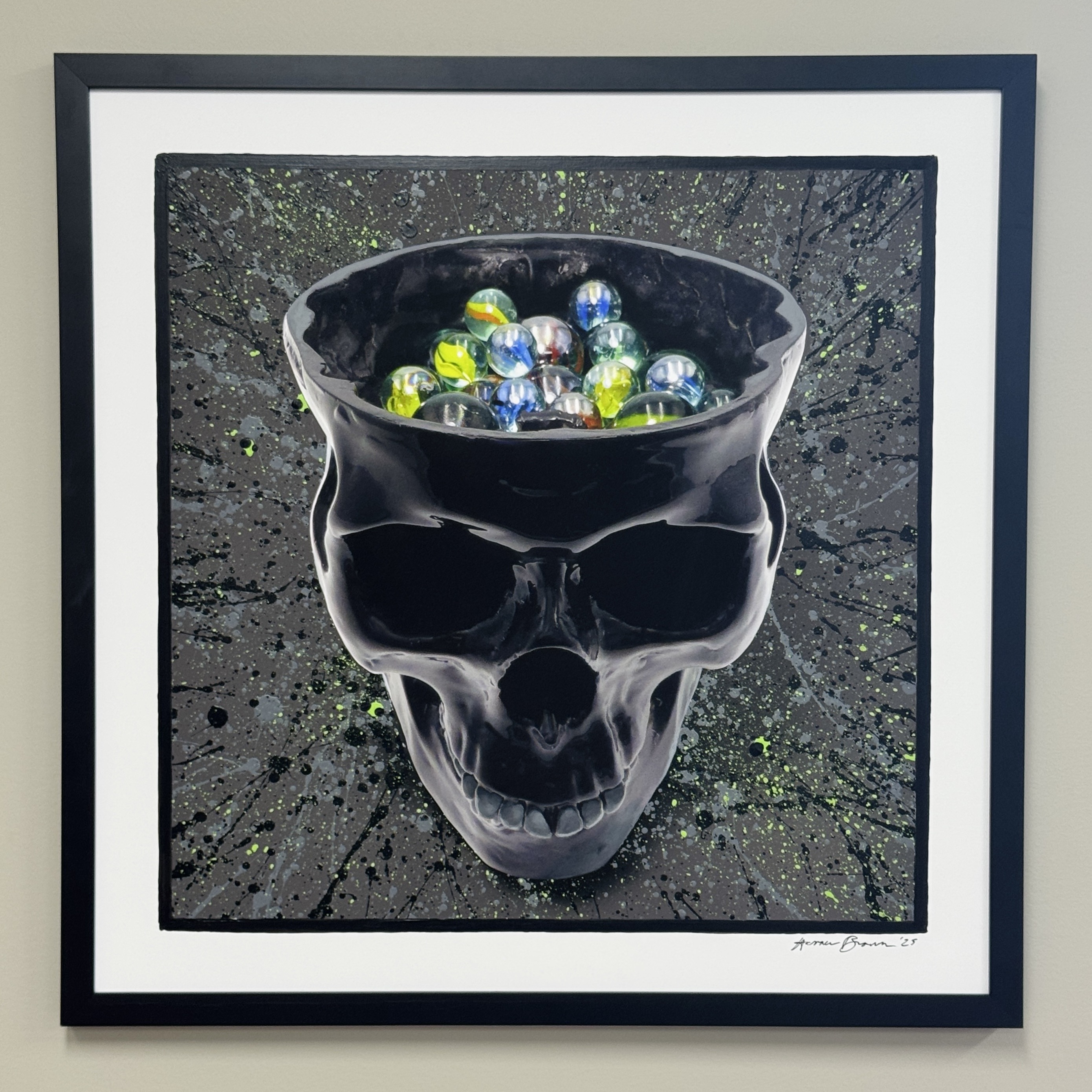 My skull paintings are acrylic paints on canvas and I also create paintings that combine my art paper skull prints with acrylic paints. All paintings are originals and signed, they are only available from the Maninspace Gallery.