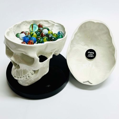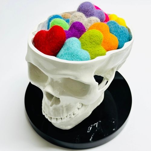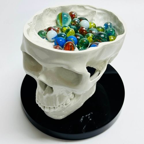 Skullptures are handmade and signed making them very special. They can be chosen in a different colour and contents to suit your home or office. A Skull with a transparent stand can have a special message or branding inside. Skulls are available but limited, contact me to discuss a skull that exists or your bespoke skull.